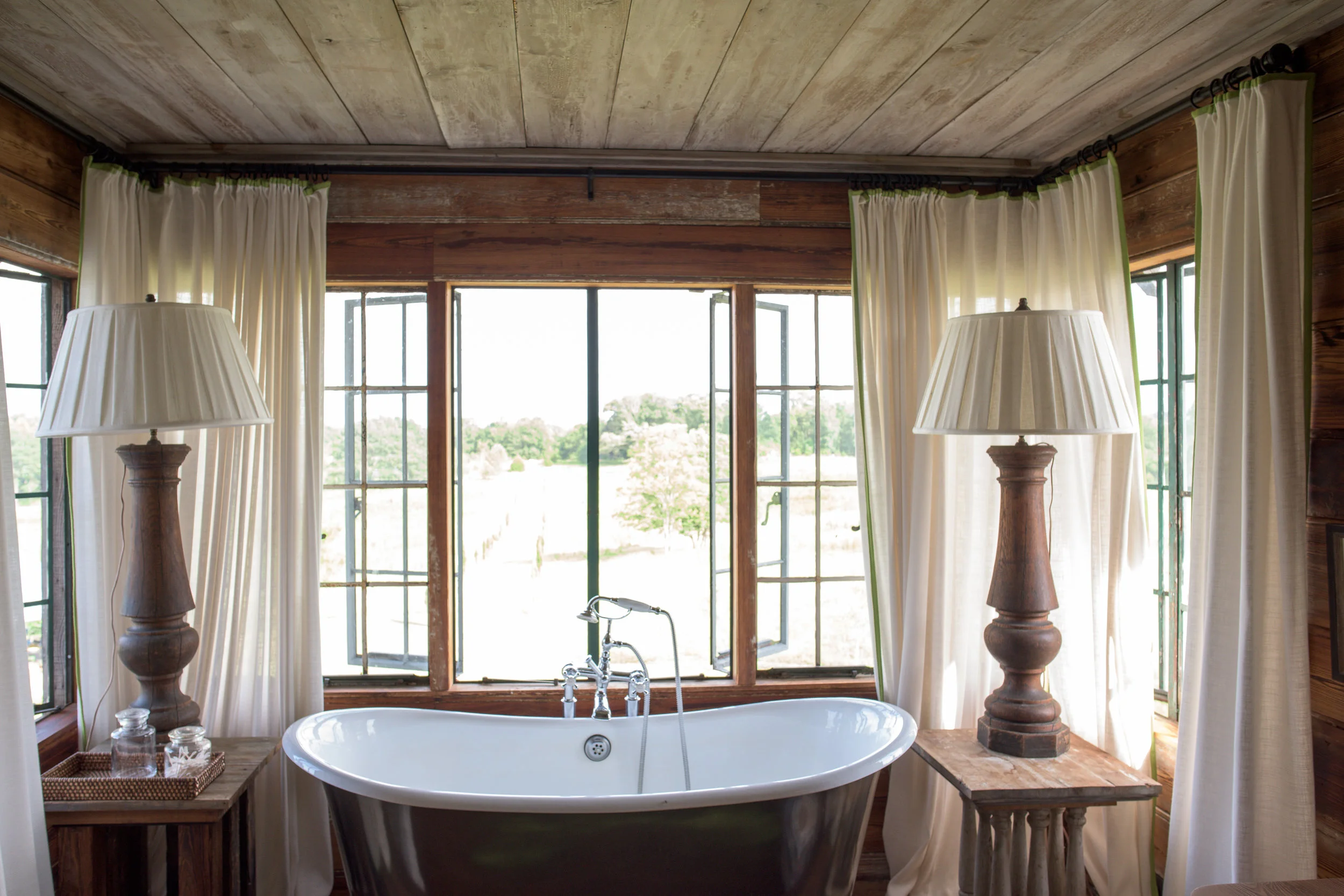 The structure is constructed of stone that was found on the property and paired with heart pine, from Vintage Lumber, to give it a look of permanence, as if it has been there a hundred years.